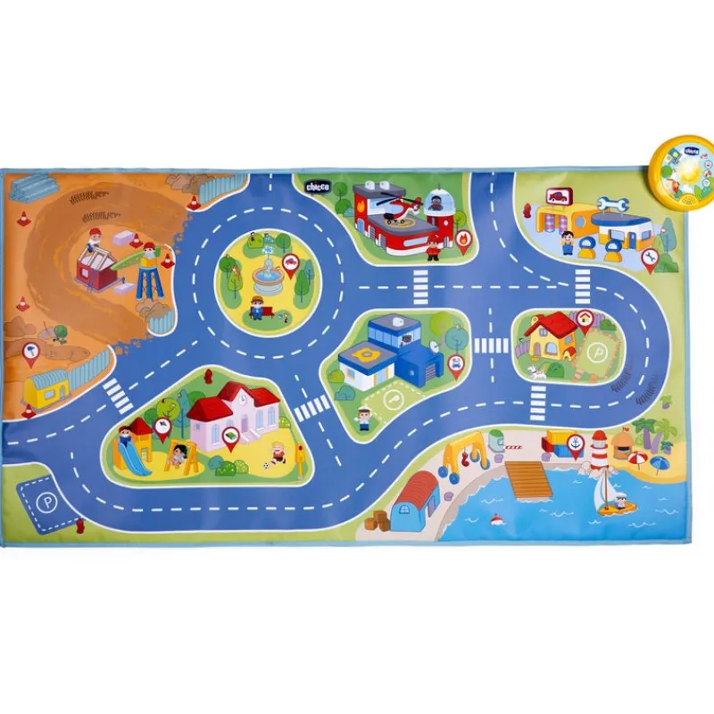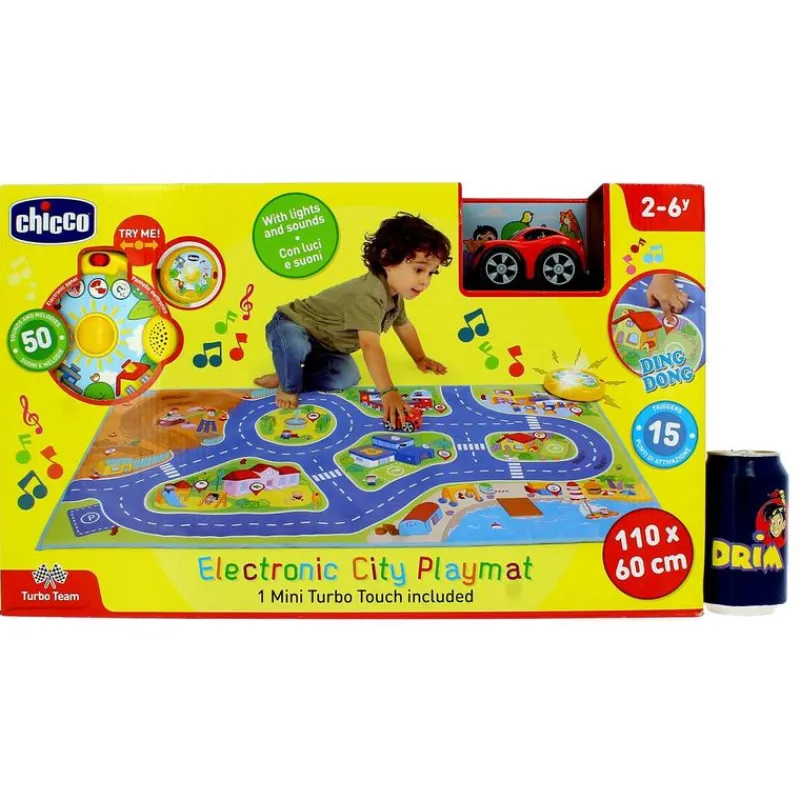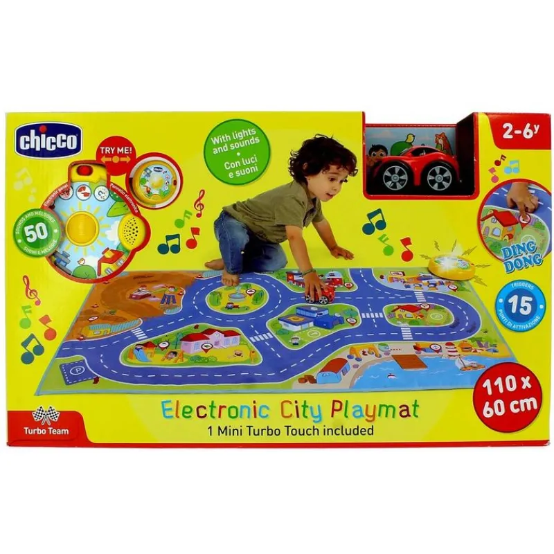 Alfombra gigante electrónica de la colección Mini Turbo Touch de Chicco. Es ideal para que l@s más pequeñ@s dejen volar su imaginación y creen las más emocionantes historias en su propia ciudad, mientras recorren sus calles con los coloridos y divertidos vehículos de la colección Mini Turbo Touch.