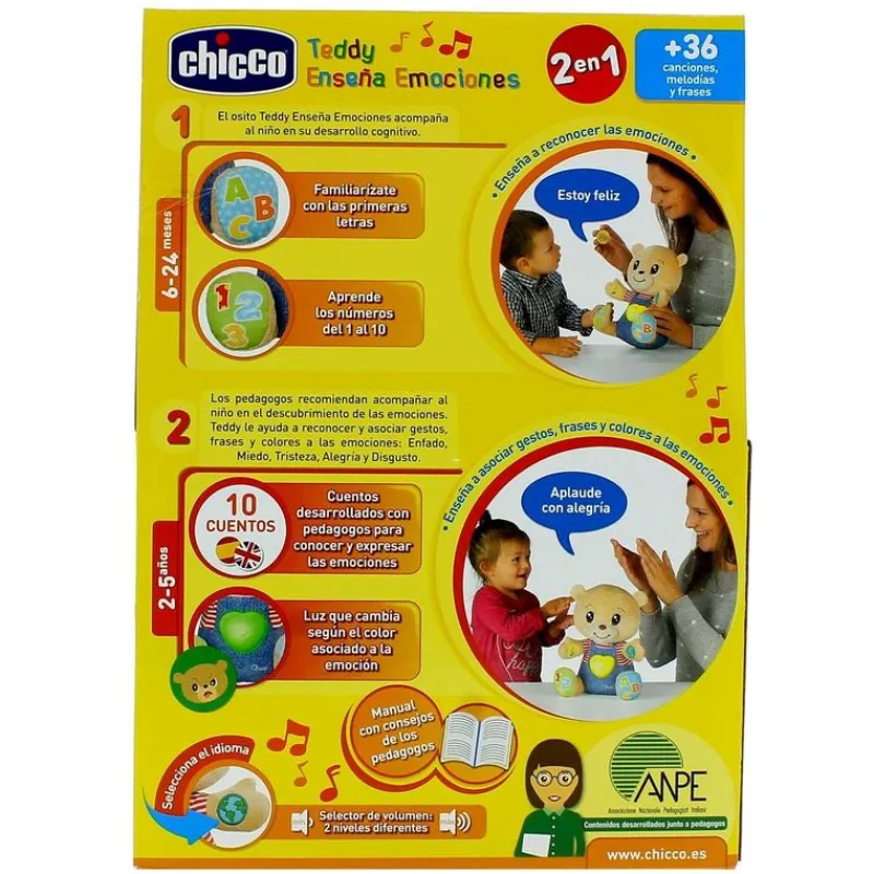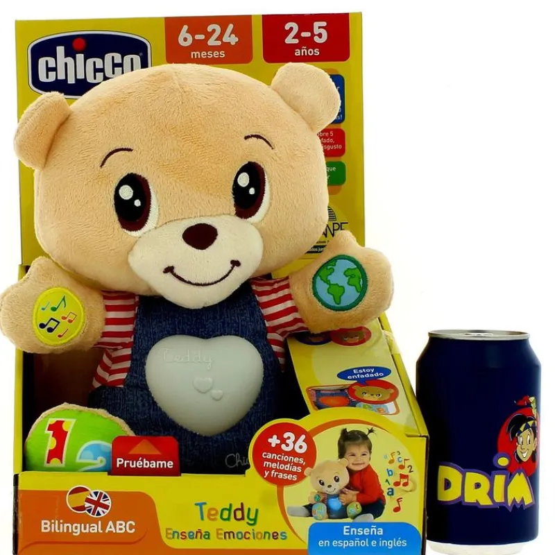 Teddy emociones es el adorable osito que se convertirá en el mejor amigo de tu pequeñ@ ¡Crecerán juntos! Es un peluche bilingüe interactivo con el que tu bebé podrá comenzar a jugar a los 6 meses, y le ayudará con el desarrollo de sus habilidades cognitivas. Una vez llegados los 2 años Teddy ayudará con el reconocimiento y expresión de las emociones ¡El corazón de su barriguita cambiará según la emoción que sienta! Contará 5 historias diferentes relacionadas con las emociones, reproduce más de 36 canciones, sonidos, habla inglés y español y su volumen es regulable. Funciona con 3 pilas AAA incluidas (pilas de demostración). Recomendado a partir de 6 meses.
