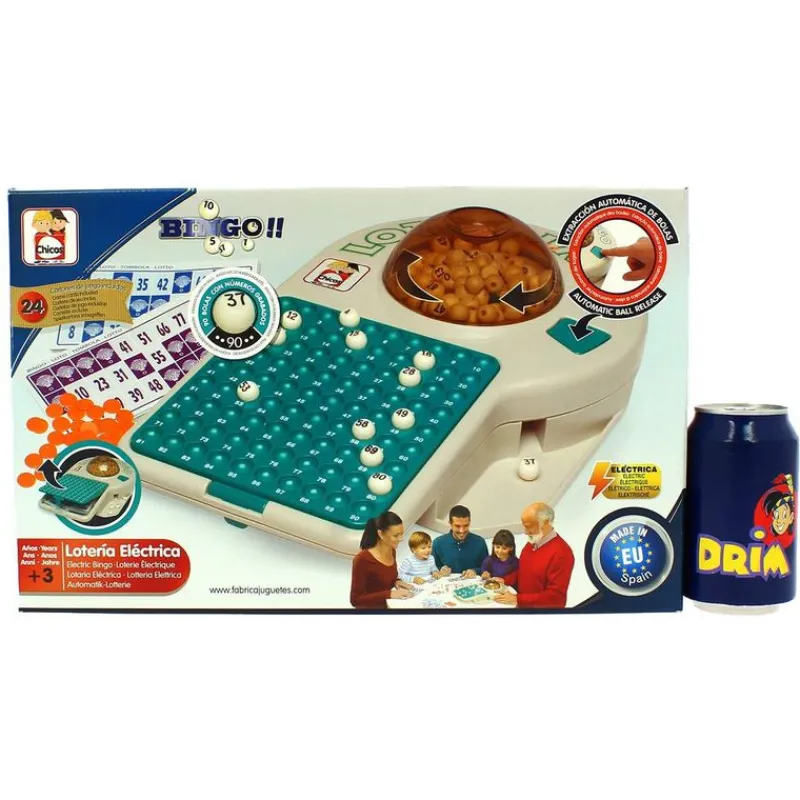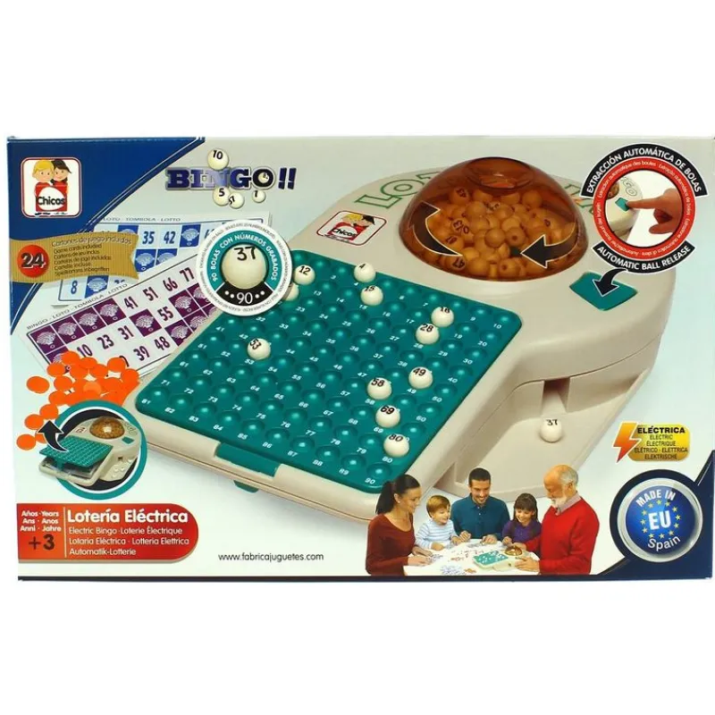 Divertida lotería eléctrica con la que podrás jugar al bingo. Dispone de extracción automática de bolas y un compartimento en el que podrás guardar los cartones una vez terminado el juego. Incluye 24 cartones para jugar y 90 bolas con números grabados. Funciona con 2 pilas C NO incluidas. Recomendado a partir de 3 años.