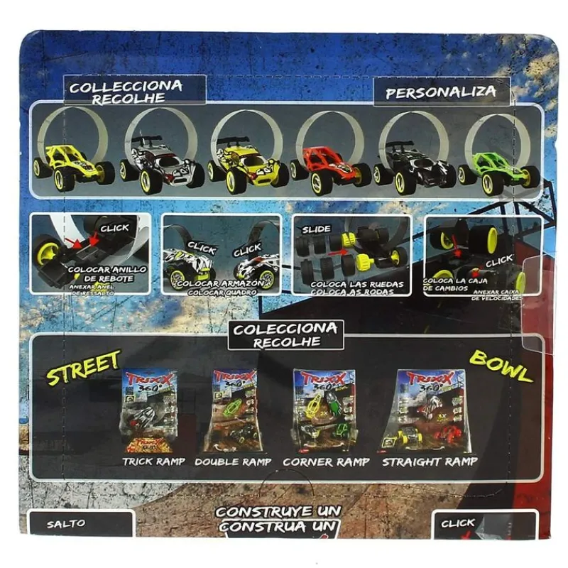 ¡Haz las acrobacias más extremas con este set! Podrás crear tu propio circuito de obstáculos con los complementos del interior: Incluye una rampa pequeña, una rampa grande, un coche negro y accesorios intercambiables. Recomendado a partir de 3 años.
