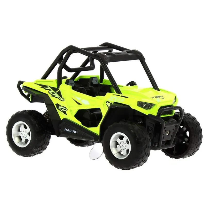 Vehículo Cross Country de color verde. Hecho de metal y con una escala de 1:22. Reproduce sonidos y luces. Funciona con sistema de fricción. Recomendado a partir de 3 años.