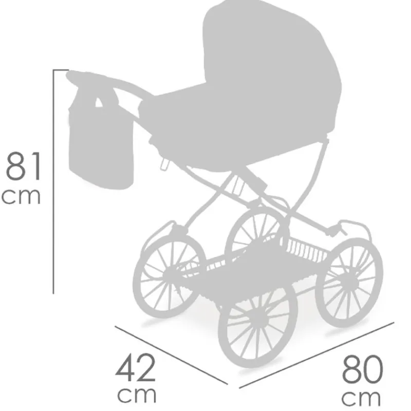 arro de muñecas de la línea Koala de DeCuevas, con estructura plegable, bandeja inferior portaobjetos, grandes ruedas de estilo clásico con cubierta de foam silencioso, manillar acolchado, capazo rígido, capota con tensores y bolso para el carro a juego. El carro tiene unas dimensiones de 81 cm de alto hasta el manillar, 42 cm de ancho x 80 cn de largo. El capazo tiene unas dimensiones de 47 cm de largo x 25 cm de ancho aproximadamente. Para muñecos de hasta 48 cm de largo NO incluido. *Nota: para ver si el carrito puede venirle bien en altura, mida desde el suelo hasta el codo de la niña y comparelo con la altura del manillar. Recomendado a partir de 3 años