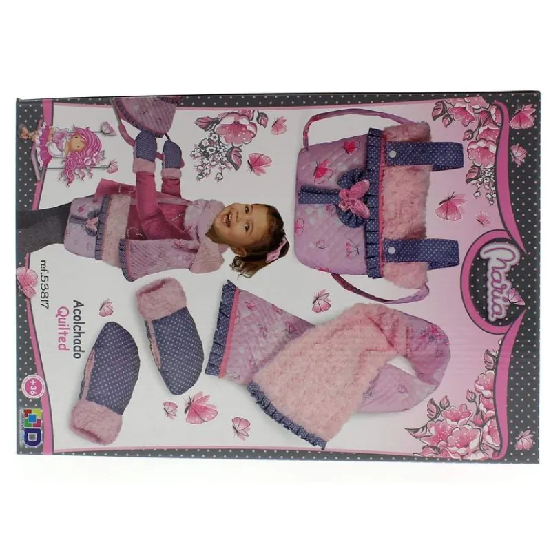 Set de complementos de invierno de la colección María de DeCuevas. Este set con bolso, bufanda y manoplas es ideal para ir a juego con tus muñecas, combina los colores rosa pastel y un elegante gris con topos. Tú también puedes disfrutar de las telas acolchadas y de pelo extra suave al lado de tus bebés. Incluye manolpas, bufanda y bolso con lazo y adorno de mariposa.