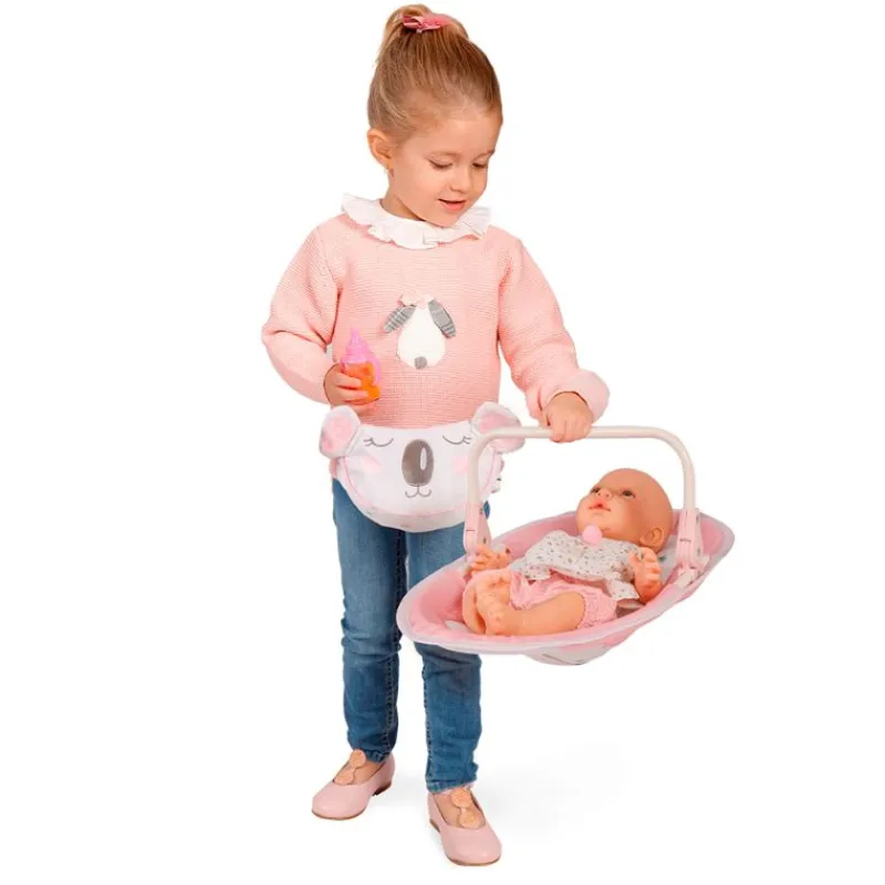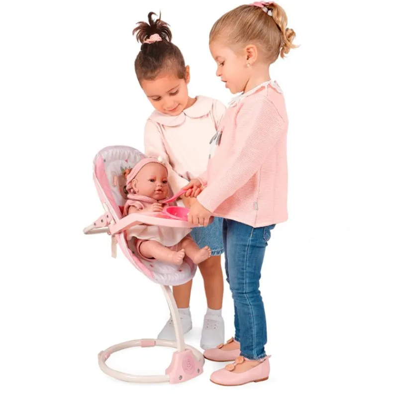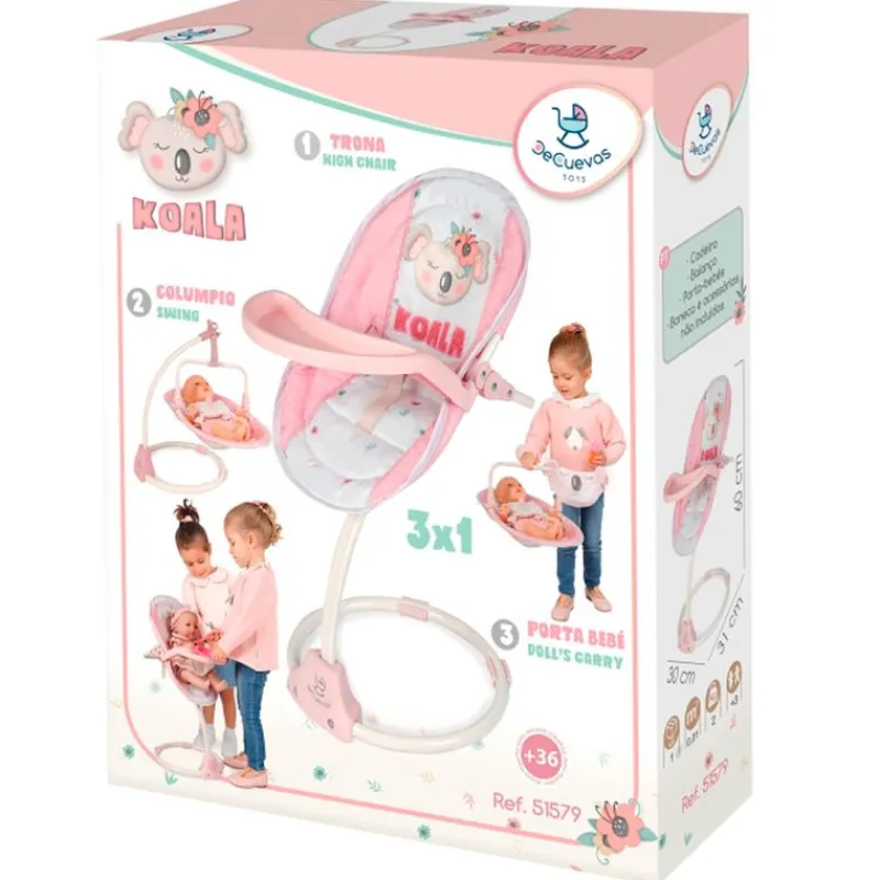 Columpio 3 en 1 para muñecas de la línea Koala de DeCuevas. La trona se puede convertir en un columpio para el muñeco bebé y también en un cómodo maxicosi para transportarlo. Dispone de bandeja, cinturón de seguridad, base estable, diseño resistente y más detalles de lujo. Dimensiones aproximadas de la trona son de 60 cm de alto x 30 cm de ancho x 31 cm de largo. Ideal para muñecas de hasta 50 cm de largo. NO contiene muñeco bebé ni accesorios. Recomendado a partir de 3 años.