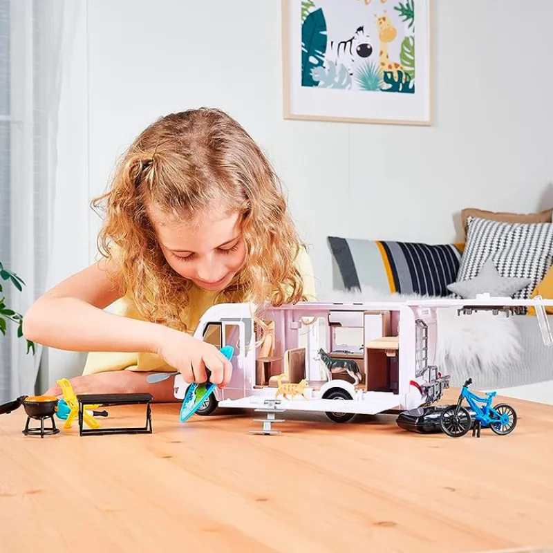 Autocaravana Mercedes con una escala de 1:24 (30 cm ) con la que podrán jugar los más pequeños de la casa. Dispone de puerta de entrada, maletero, panel lateral y techo que se puede abrir ¡Despliega el playset para poder jugar! Contiene un personaje, una barbacoa, una mesa, silla, tabla de surf, maletero de techo, bicicleta y una mochila. En el interior de la caravana encontrarás una cocina, muebles abatibles, una cama doble, portabicicletas, una antena parabólica y muchos más. Reproduce luces y sonidos. Funciona con 2 pilas LR44 incluidas (pilas de demostración). Recomendado a partir de 3 años.