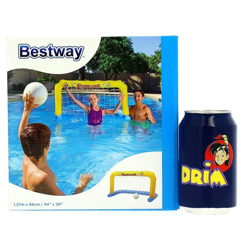 Portería hinchable con pelota para usar en la piscina y disfrutar del deporte mientras te refrescas. Medidas: 71 x 137 x 67 cm, aproximadamente.