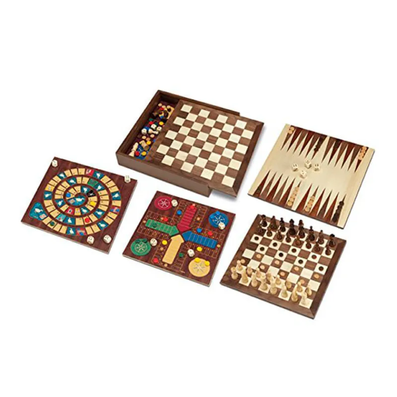 Completo pack que incluye 5 juegos clásicos de madera: la oca, el parchís, el ajedrez, el backgammon y las damas. Los juegos quedan recogidos en una práctica caja de madera en donde también podrás guardar los accesorios. Ideal para pasar horas de diversión jugando en familia. De 2 a 4 jugadores.