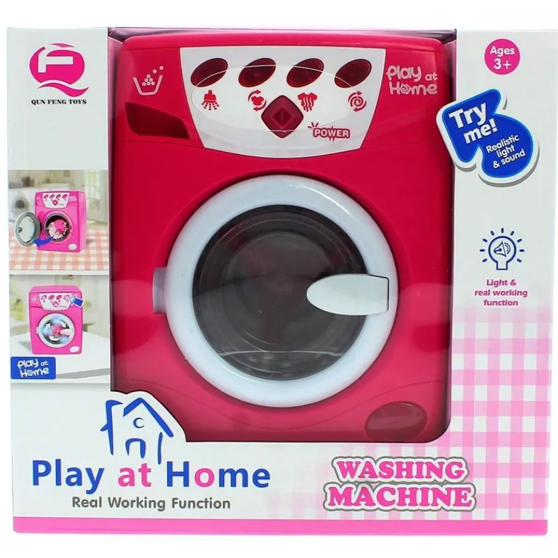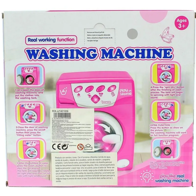 Lavadora con luces y sonidos reales con un diseño divertido de color rosa. Sus dimensiones son de 30 cm x 28 cm x 16 cm aproximadamente.