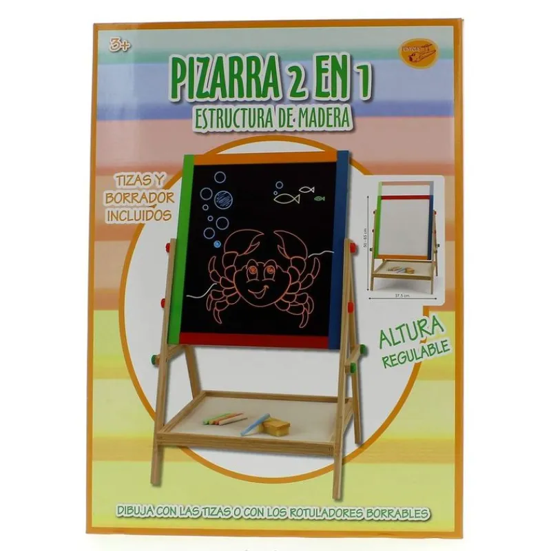Pizarra de madera 2 en 1 con altura regulable. Por una parte se puede escribir con tizas y por la otra con rotuladores vileda. Incluye tizas y borrador.