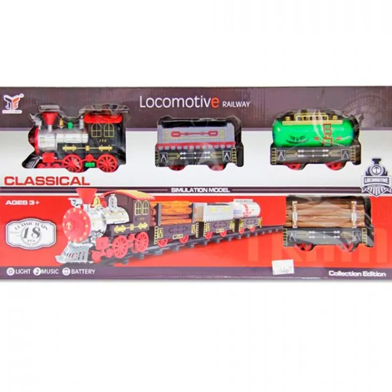 Tren tipo locomotora que mientras recorre las vías reproduce luces y sonidos. Funciona con pilas NO incluidas. Recomendado a partir de 3 años.