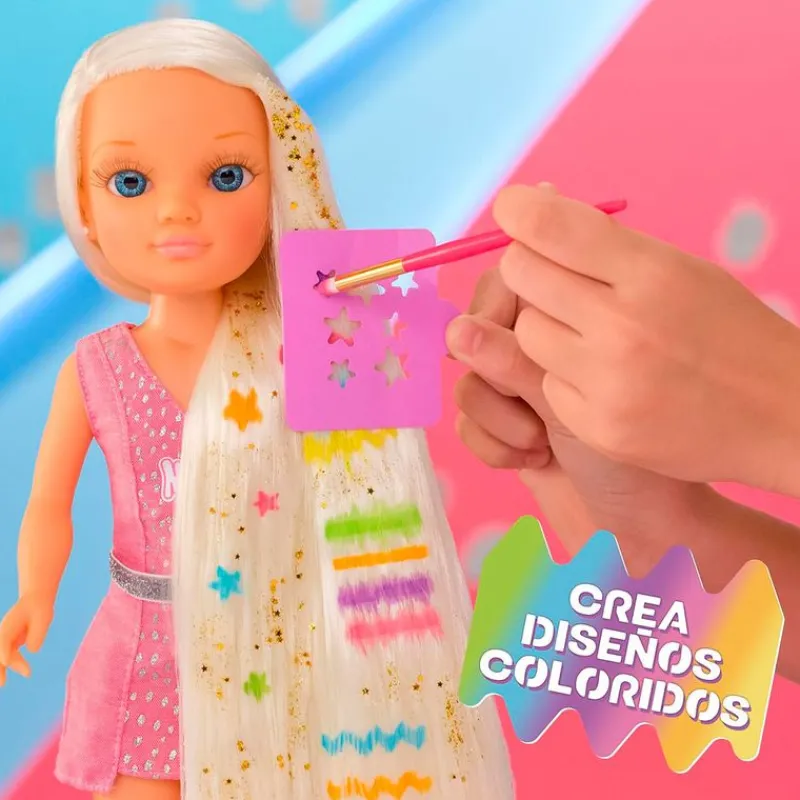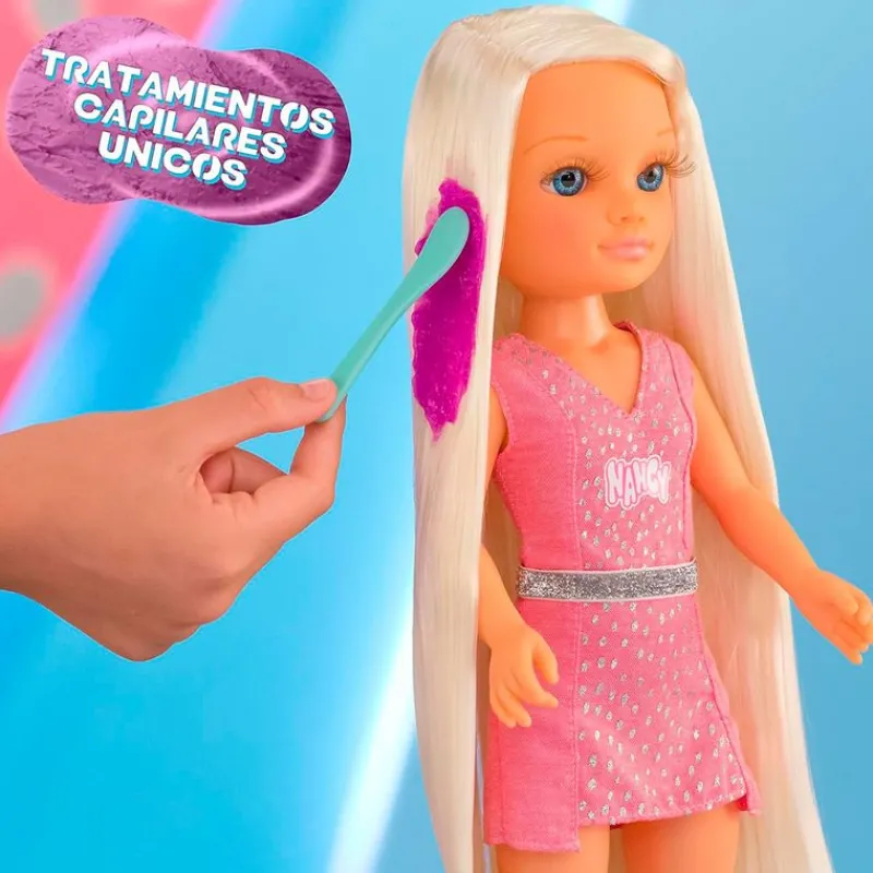 Muñeca Nancy con una impresionante melena extra larga que podrás decorar y crear muchísimos peinados nuevos y sorprendentes ¡Podrás hacerle tratamientos al cabello de Nancy! En el interior encontrarás un cepillo especial para desenredar su melena, mascarillas capilares, purpurina y muchos estampados para ponerle colores a su pelo o dibujos. Recomendado a partir de 3 años.