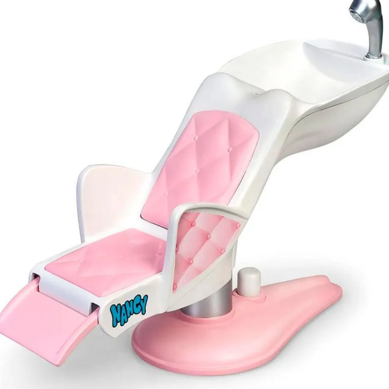Nancy necesita cuidar su preciosa melena y pasará un divertido día en la peluquería contigo. En el interior encontrarás un pack de belleza con muchos accesorios y elementos de peluquería. Nancy va vestida con un mono turquesa, unas bailarinas rosas y un pañuelo en el cabello. Sienta a Nancy en el sillón reclinable para que pueda lavarse el pelo como si estuviera en una peluquería de verdad ¡El lavado funciona gracias al depósito y al botón que hay en el pie del sillón! El grifo se puede sacar y extender ¡Seca el cabello de Nancy con la toalla! Peina a Nancy con los peines, botes, un secador, una plancha del pelo, unas tijeras y un espejito. La muñeca tiene un tamaño de 42 cm aproximadamente. Recomendado a partir de 3 años.