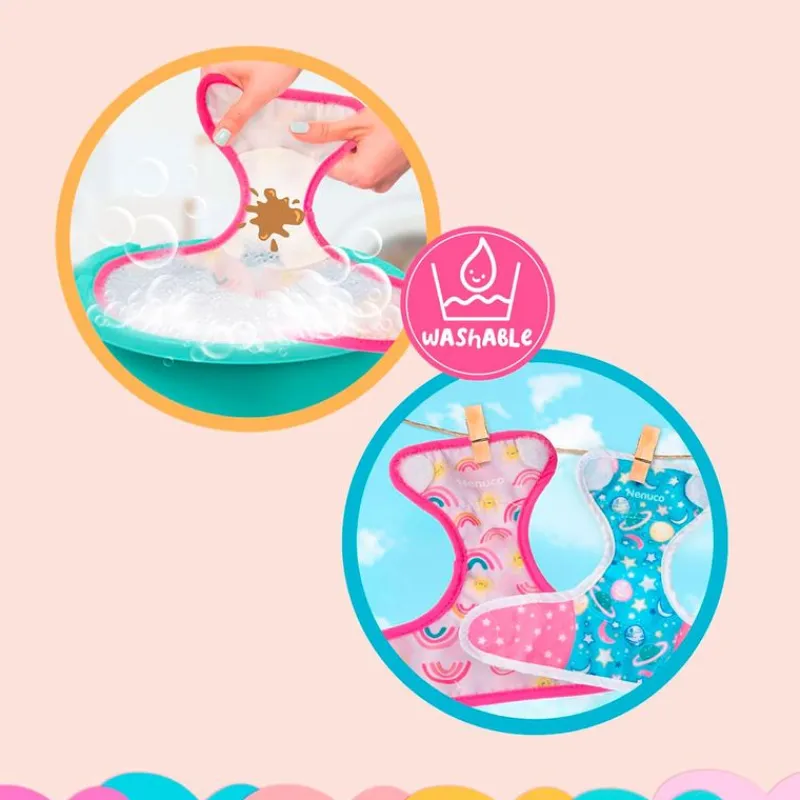 Incluye 2 pañales lavables, uno para el día y otro para la noche con adornos que brillan en la oscuridad.