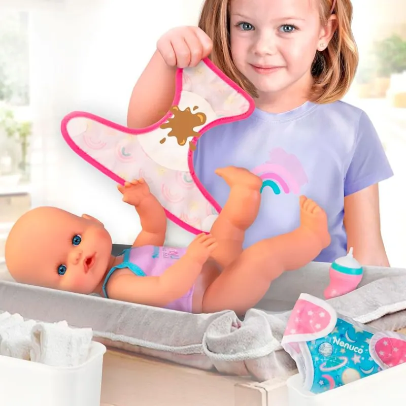Muñeco bebé de la colección Nenuco fabricado en cuerpo rígido y camiseta de quita y pon.