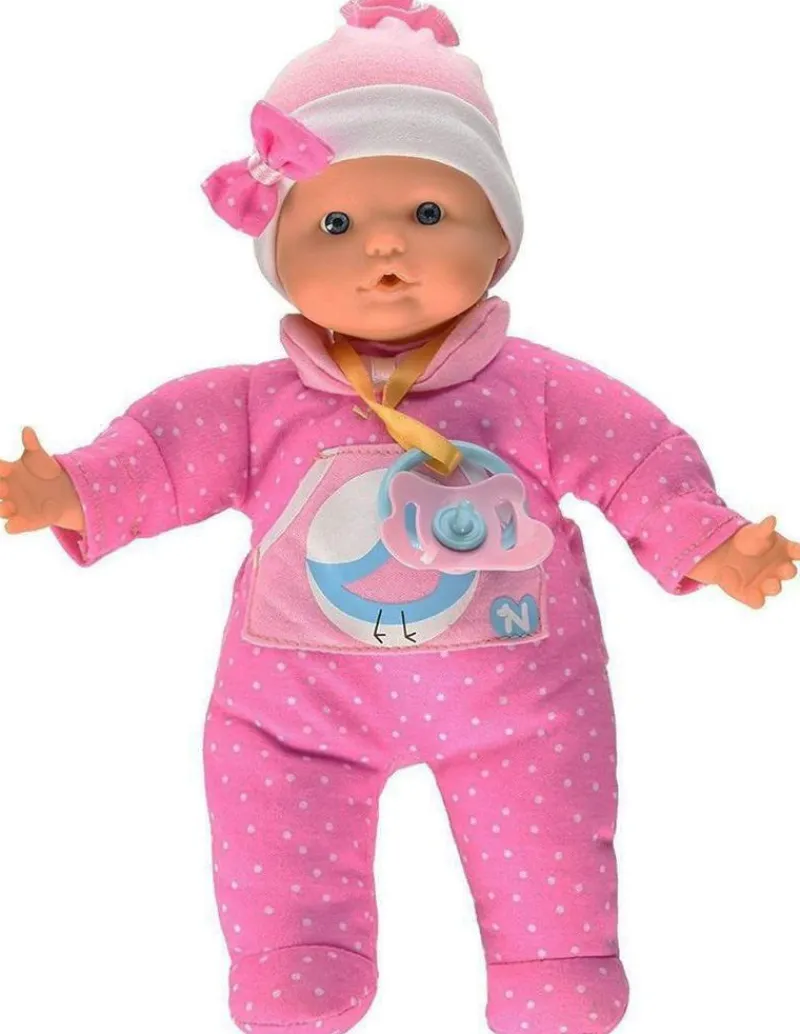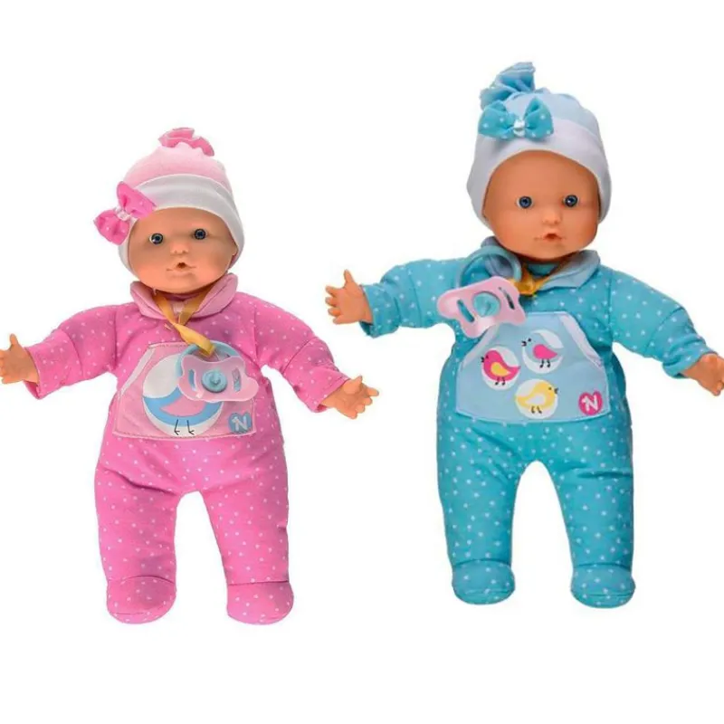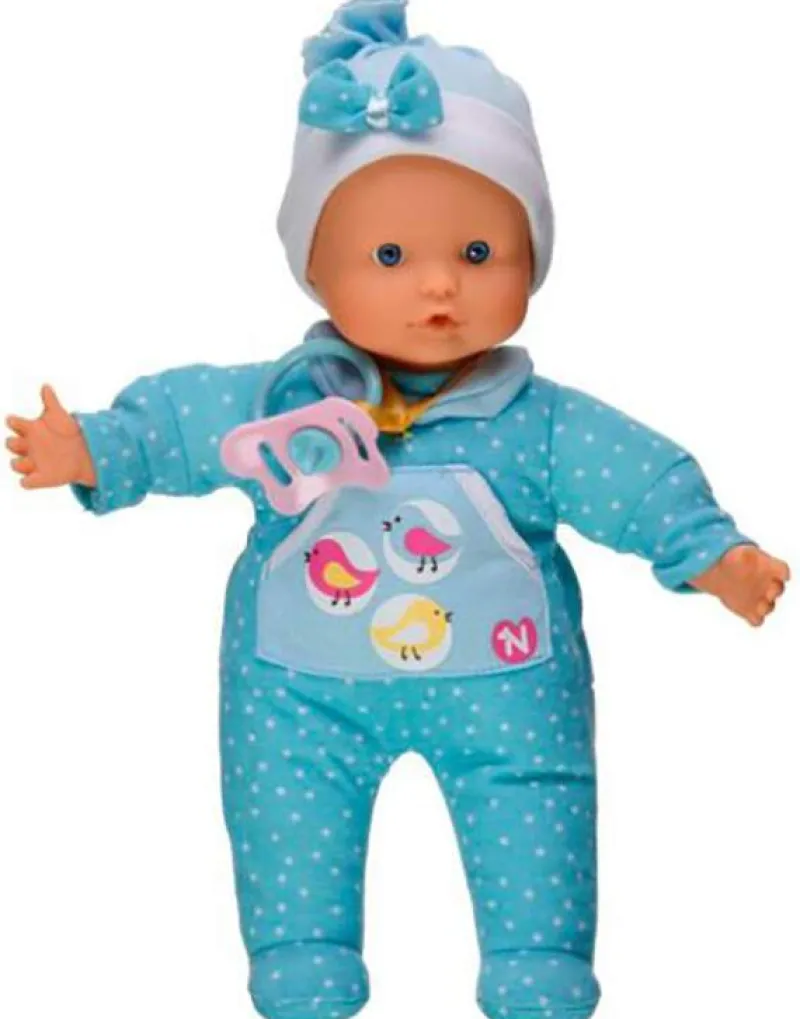Muñeco blandito llorón con vestido de pájaros y con su gorro con lazo, cuando le pones el chupete hace el sonido como si estuviera chupando y si se lo quitas se pondrá a llorar ¡Waaahh waaahh!! también le puedes poner su dedito en la boca.