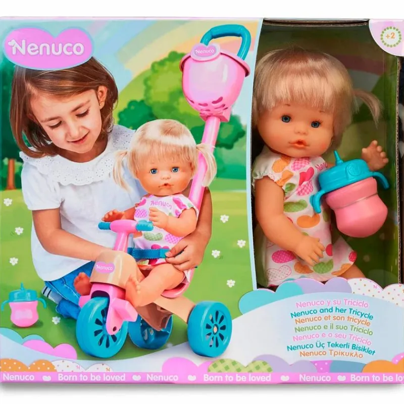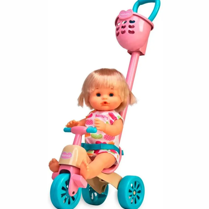 Nenuco y su triciclo incluye una muñeca rubia de 35 cm y cuerpo duro con vestidito. El triciclo luce un bonito diseño rosa, amarillo y azul. Dispone de cinturón para la muñeca, ruedas y una cesta extraíble para que lleves complementos para cuidar de tu bebé donde quieras. Las medidas están adaptadas para niñas de 5 años.