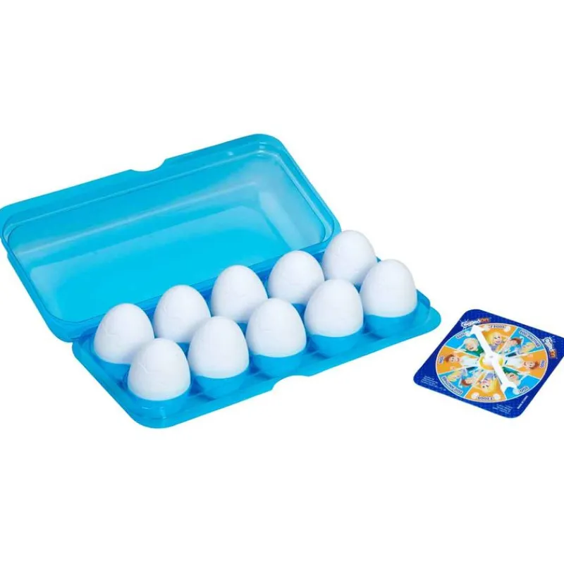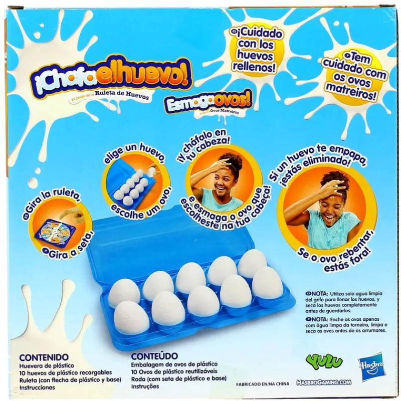 Divertidísimo juego para jugar en familia y/o con tus amigos. Haz girar la ruleta ¡y desafía a tu suerte! Te puede tocar chafar un huevo en tu cabeza, chafar dos huevos, chafar un huevo en la cabeza de tu compañero y ¡suerte! pasa tu turno. Eso sí, si te empapas ¡estás eliminado! Juego de mesa para 2 – 4 jugadores.