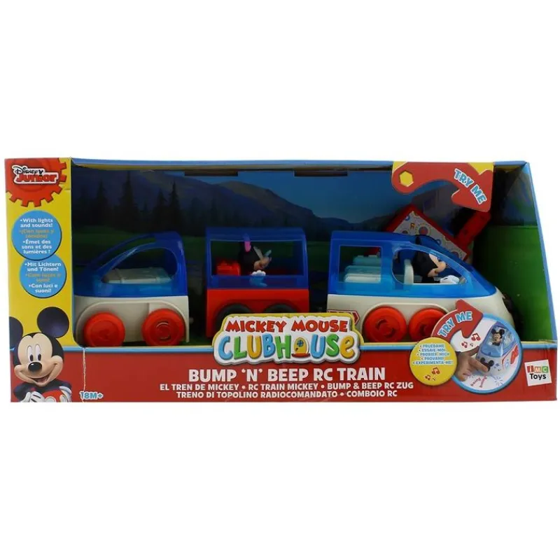 Controla y dirige este increíble tren teledirigido de Mickey y Minnie. ¡Chuu-chuu! Con luces y divertidos sonidos cuando choca. ¡Vamos de viaje! No incluye figuras.