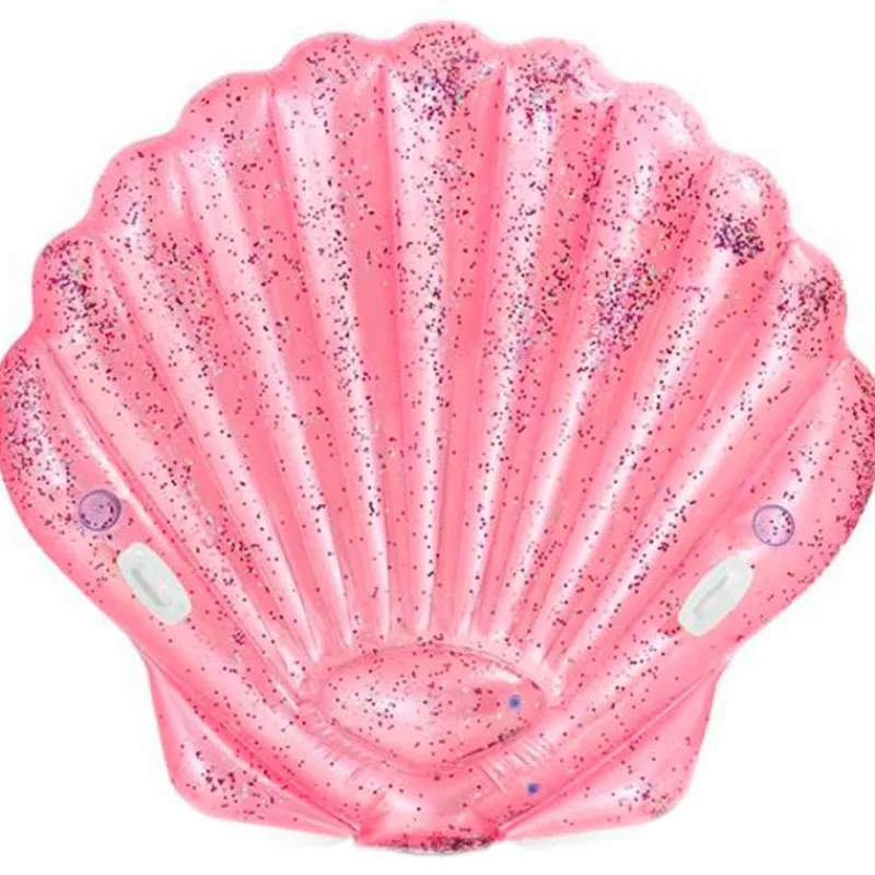 Colchoneta de tipo isla en forma de concha rosa con purpurina ¡El complemento perfecto para relajarse en el agua!
