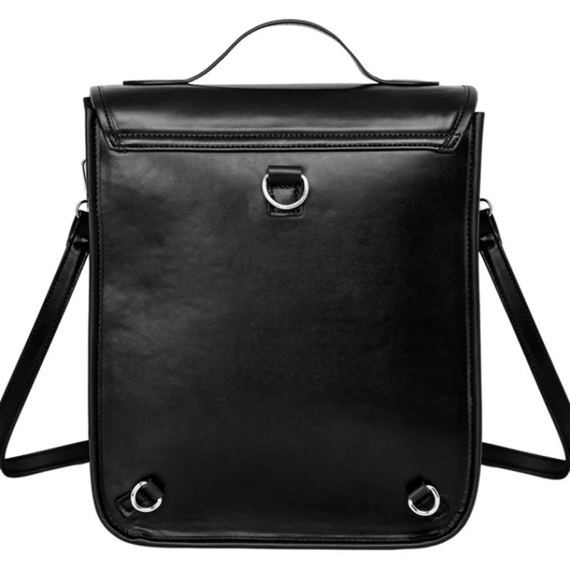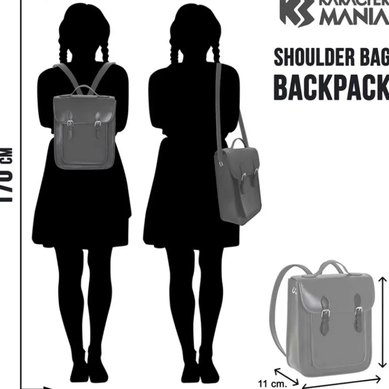 Bolso convertible en mochila inspirado en la serie de Netflix de Miércoles Addams. Bolso-mochila con cierre de dos imanes y bolsillo frontal cubierto por una solapa. Con forro interior con compartimento acolchado para dispositivos electrónicos y otros bolsillos adicionales. Asa bandolera de 122 cm convertible en correas al hombro. Sus dimensiones son de 34 cm x 28 cm x 11 cm aproximadamente.