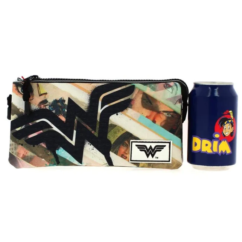 Estuche del tipo portatodo triple, inspirado en el personaje de DC Comics, Wonder Woman. Dispone de 3 compartimentos diferentes para que puedas guardar en su interior tus objetos personales o material escolar. Sus dimensiones son de 23.5 cm x 10 cm x 5 cm aproximadamente. En nuestra web encontrarás la mochila escolar a juego (Ref 37571 – se vende por separado).
