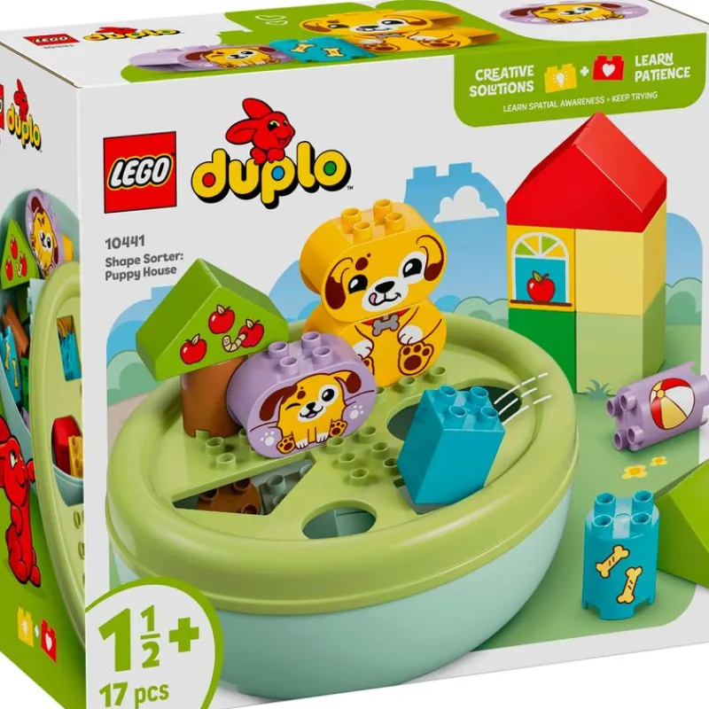 Pack de la colección Lego Duplo, compuesto de 17 piezas, con las que los más pequeños de la casa podrán reforzar la motricidad fina, enseñar las formas y resolver problemas mientras usan los ladrillos para construirles a los cachorros un lugar para jugar o introducen formas por los agujeros de la tapa.