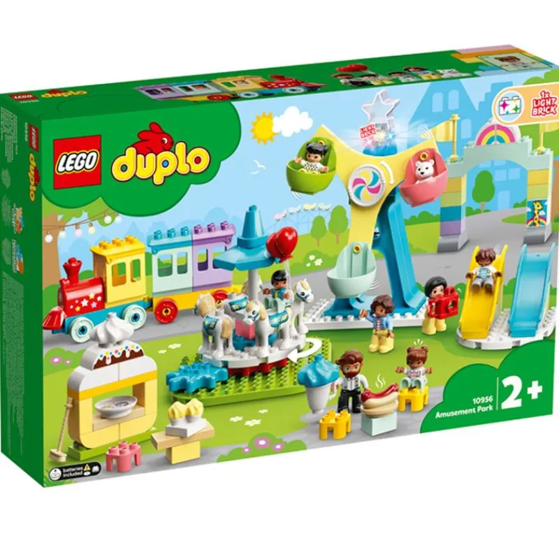 Pack de la colección LEGO Duplo, compuesto de 95 piezas, con el que podrás construir un parque de atracciones. Contiene toboganes por los que deslizarse, un tiovivo mecánico en el que subirse, una gran noria con 3 vistosas góndolas para hacerla girar, un tren para dar paseos por el parque y accesorios como un helado, una cámara, globos, pastelillos, una escoba, un osito de peluche y 7 figuras de la colección. Recomendado a partir de 2 años.
