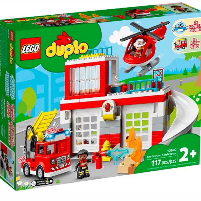 Pack de colección LEGO Duplo, compuesto de 117 piezas, con las que construir el parque de bomberos y el helicóptero. En el parque de bomberos podrás deslizarte por el tobogán y subir al camión de bomberos Push & Go, que sale por la gran puerta batiente con sus luces parpadeantes encendidas y sirena sonando (pilas incluidas). Contiene un helicóptero que despega desde el tejado para unirse a la misión. Incluye las figuras de un bombero, una bombera, un camión con escalera, una manguera, luces y sirena y un helicóptero. Tiene unas dimensiones de 37 cm de alto x 48 cm de ancho x 43 cm de profundidad. Recomendado a partir de 2 años.