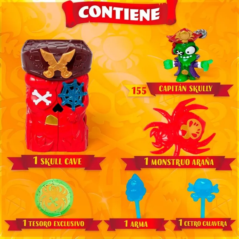 Pack de la colección Piratix en el que encontrarás un skull cave, al capitán skully, un monstruo araña, un tesoro exclusivo, un cetro calavera y un arma.