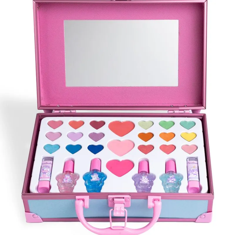 Maletín de maquillaje con diseños de unicornio en el que encontrarás 18 sombras de todos los colores del arcoíris, 4 esmaltes de uñas con purpurina, 3 coloretes y 2 pintalabios.