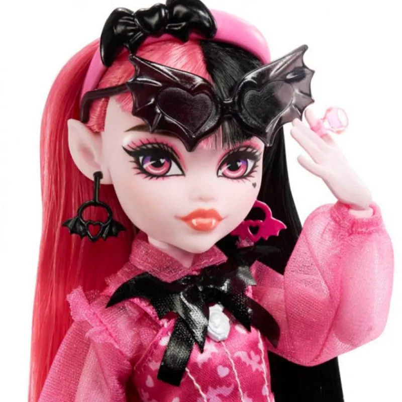 Muñeca de Draculaura, personaje de la colección Monster High. Es articulada y tiene un tamaño de 32 cm aproximadamente. Viste un corsé blusa con mangas transparentes y unos pantalones cortos con estampado de corazones, un look precioso a la vez que espeluznante. Viene acompañada de su amigo Conde Fabuloso y montones de accesorios. Recomendado a partir de 3 años.