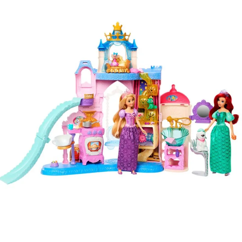 El conjunto de juego cuenta con siete áreas de juego, cada una de ellas inspirada en una de las princesas favoritas de Disney, como un columpio inspirado en Cenicienta, una cocina y una silla para tomar el té inspiradas en Bella, y una bañera y un tocador inspirados en Ariel.