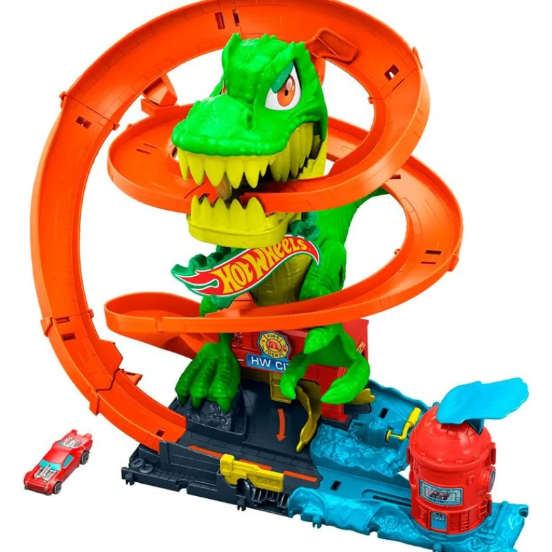 Lucha contra un hambriento T-Rex que ha invadido la estación de bomberos de Hot Wheels City con este conjunto interactivo.