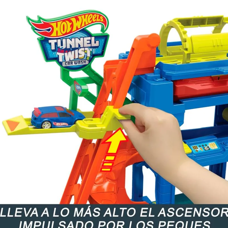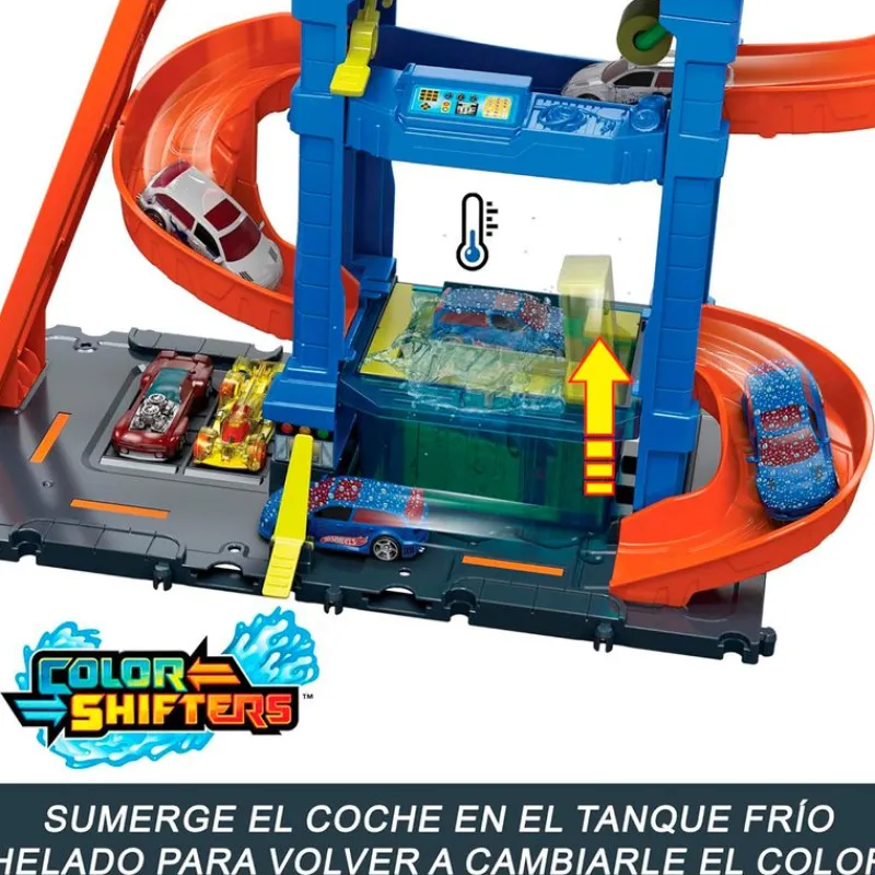 Coge el ascensor para elevar el coche hasta la planta superior del túnel de lavado. El conjunto contiene un vehículo de la colección Hot Wheels Color Shifters con una escala de 1:64 ¡Dale vueltas al túnel para rociar el coche Color Shifters con agua muy caliente e inicia el primer cambio de color! Sal del túnel y baja la rampa hasta la estación de decoración, donde hay un rodillo de espuma y un aspirador para una limpieza completa. Sumerge el vehículo en el tanque de agua fría para devolverlo a su aspecto original. Tanto el tanque de agua caliente como el de agua fría se extraen fácilmente para una limpieza sencilla. Recomendado a partir de 3 años.