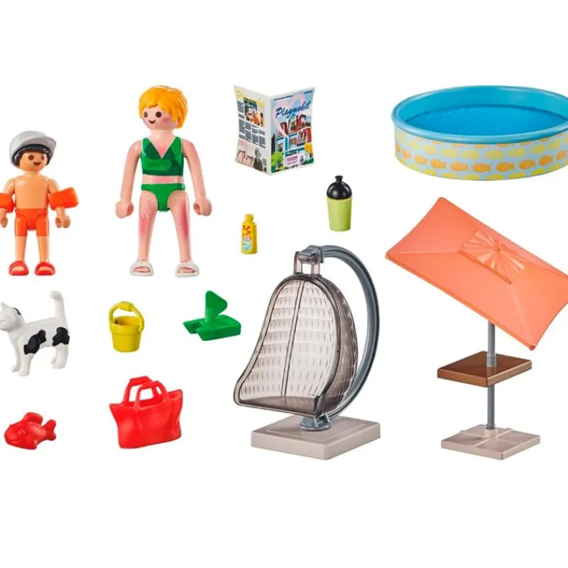 Pack de la colección Playmobil en el que encontrarás una madre y a su hijo mientras disfrutan del buen tiempo. La madre se relaja en la silla colgante observando como el pequeño chapotea. Antes de tomar el sol es importante aplicares la crema solar con regularidad. La figura femenina se pone roja bajo la exposición a los rayos UV. Acompañado de complementos. Recomendado a partir de 4 años.