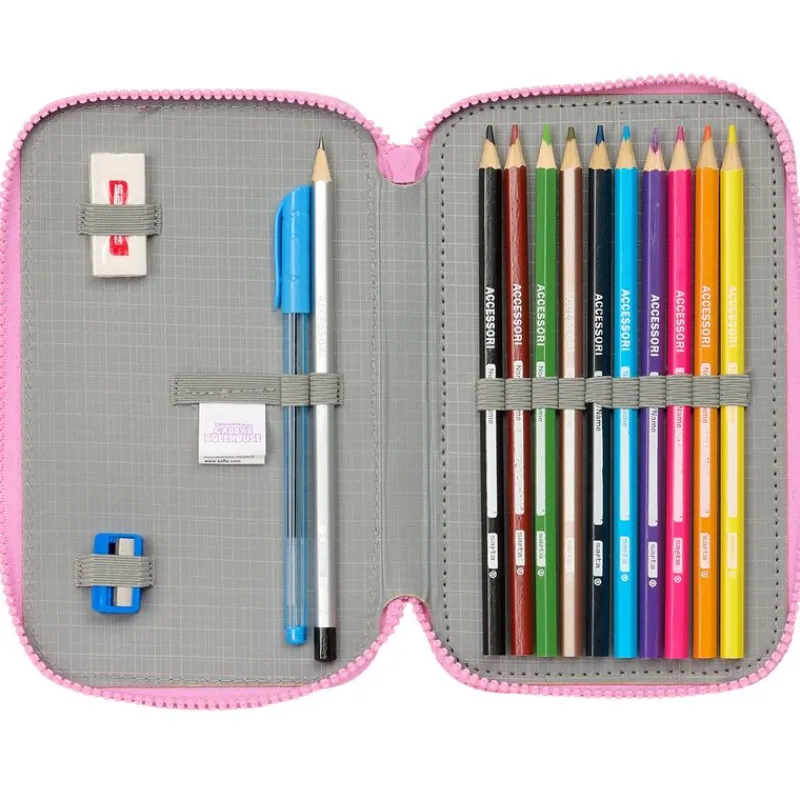 Estuche doble con diseños inspirados en la serie de animación la Casa de Muñecas de Gabby. En el interior encontrarás goma, sacapuntas, lápiz, bolígrafo, lápices de colores y rotuladores. Sus dimensiones son de 19.5 cm x 12.5 cm x 4 cm aproximadamente.