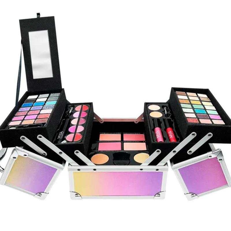 Estuche de maquillaje con asa para que puedas llevarlo a todas partes contigo. Dispone de diferentes compartimentos en los que guardar tus accesorios de maquillaje. Contiene pintalabios, pinceles, sombras de ojos, colorete, espejo y muchos más.