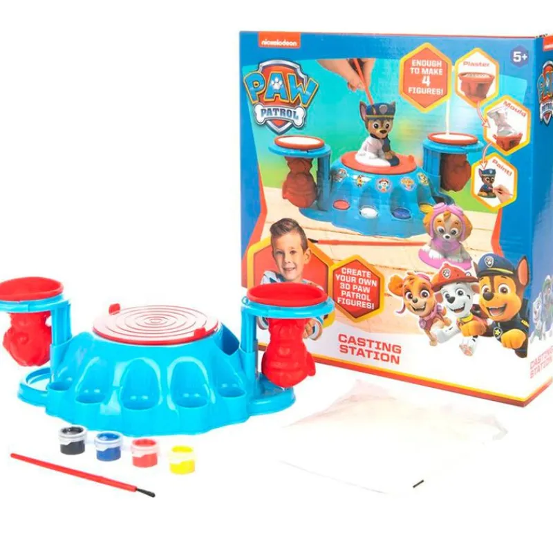 Pack para crear figuras 3D de yeso inspirada en los personajes de la serie de animación Patrulla Canina. En el interior encontrarás moldes de silicona de Chase y Skye. Incluye 5 colores de pintura, pincel, yeso, 3 moldes y una estación de escayola. Recomendado a partir de 5 años.