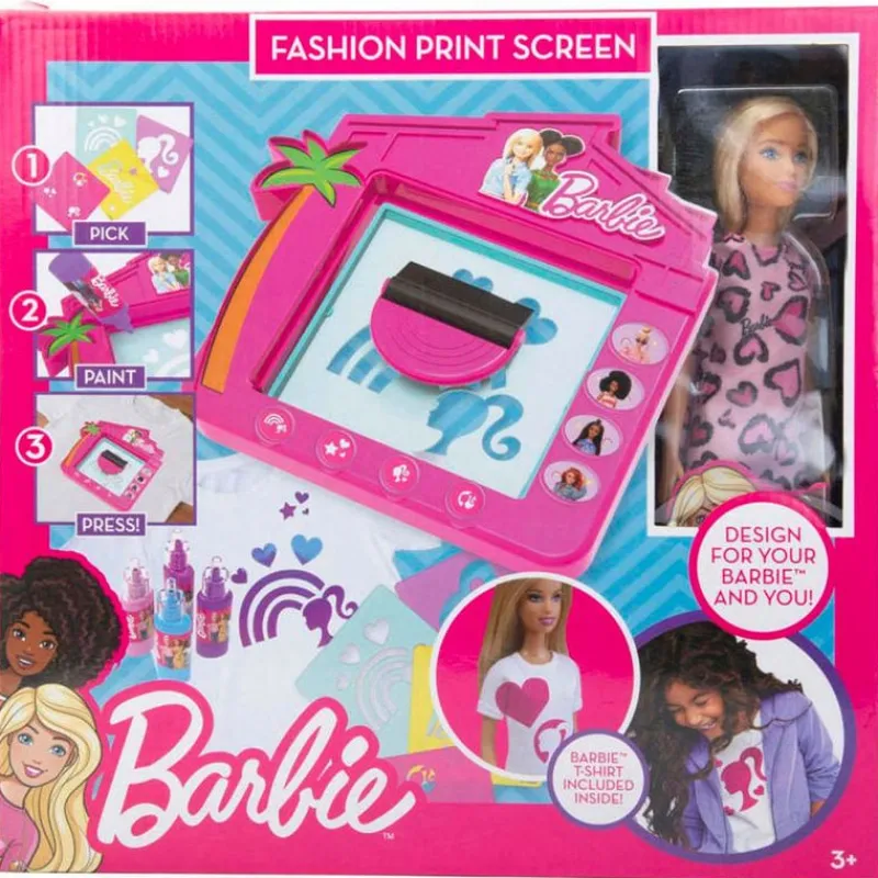 Estudio de moda Barbie con el que podrás comenzar a imprimir diseños relacionados con la muñeca en tela. Solo tendrás que colocar la prenda en la superficie limpia, escoger una de las plantillas, deslizarla debajo de la maya y usar el control deslizante para esparcir la pintura. Contiene una muñeca Barbie. Recomendado a partir de 3 años.