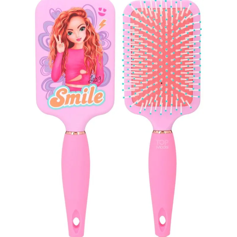 Cepillo de pelo de la colección Top Model con un colorido diseño. Es cuadrado con numerosas púas y superficie de goma suave que hace el peinado agradable. Sus dimensiones son de 26 cm x 8.3 cm x 4.2 cm aproximadamente. Recomendado a partir de 5 años. EXISTEN MODELOS DIFERENTES. SE VENDEN POR SEPARADO. SE SURTIRÁN SEGÚN EXISTENCIAS. AL REALIZAR LA COMPRA, PUEDES RECIBIR CUALQUIER MODELO SURTIDO AL AZAR, INCLUIDOS MODELOS QUE NO SE ENCUENTREN EN LAS FOTOS. PRECIO POR UNIDAD.