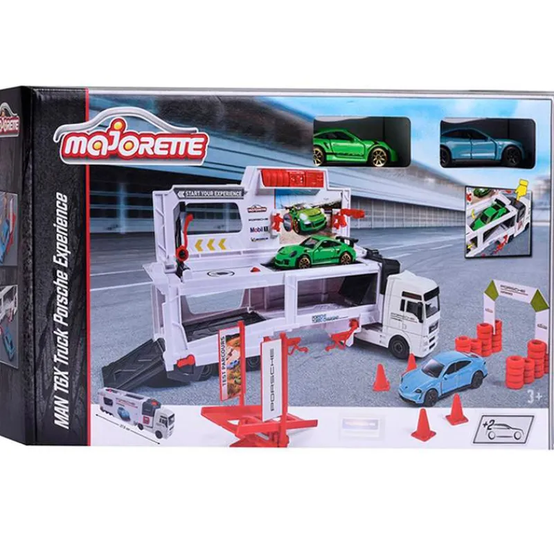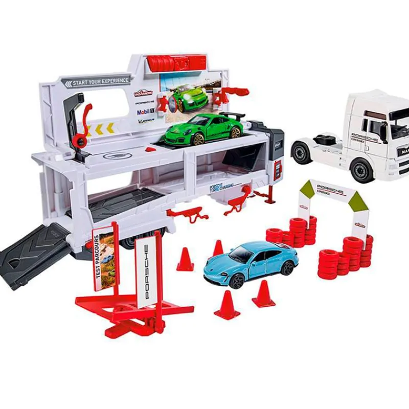 Camión Porsche Experience que podrás abrir para que puedas poner tu coche de carreras apunto. Contiene dos vehículos de escala 1:64. El camión mide 27 cm aproximadamente. Recomendado a partir de 3 años.