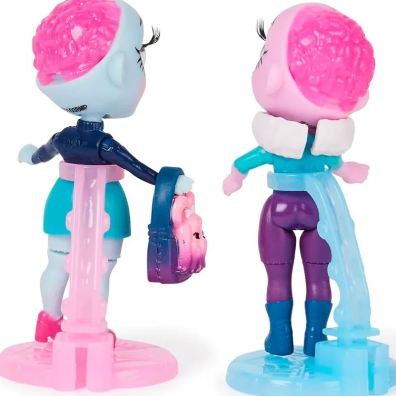 En el interior encontrarás 2 mini muñecas zombie de 8.9 cm aproximadamente, un ataúd para mascota con amiguito sorpresa en el interior, accesorios para muñecas, soportes y una tarjeta coleccionable holográfica y una caja con forma de ataúd.