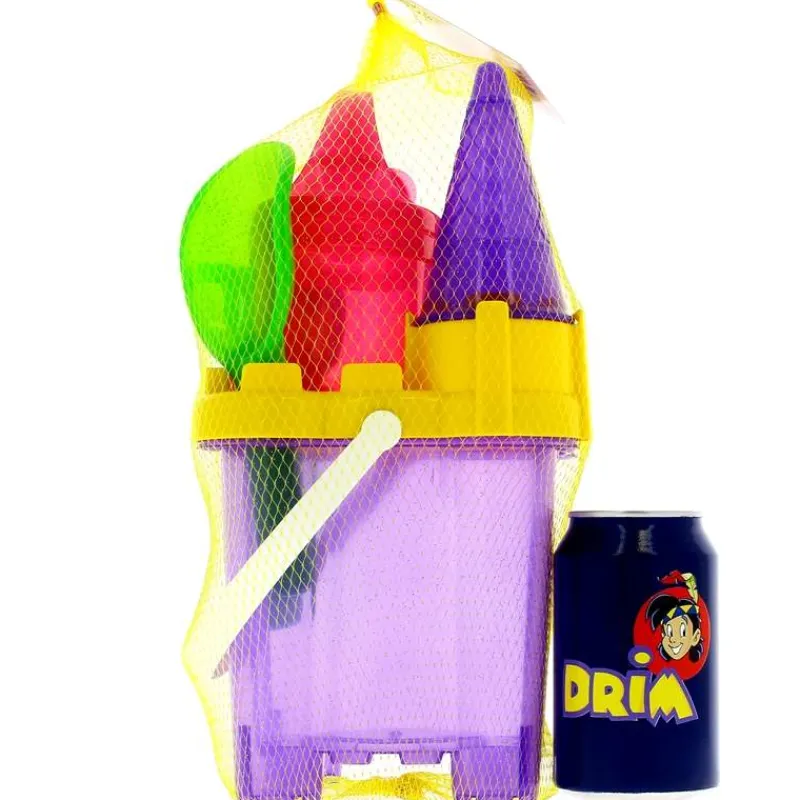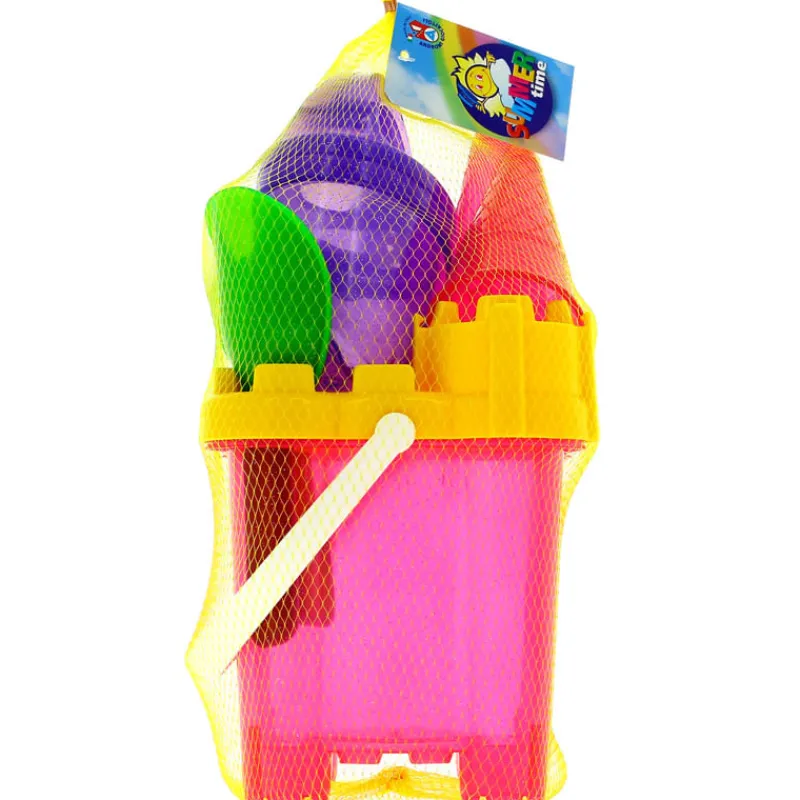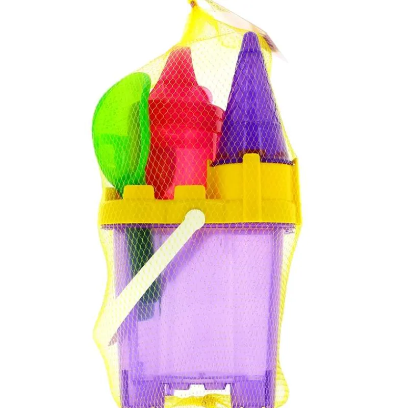 Conjunto de playa en forma de castillo y con accesorios: cubo, regadera, pala, rastrillo y moldes.