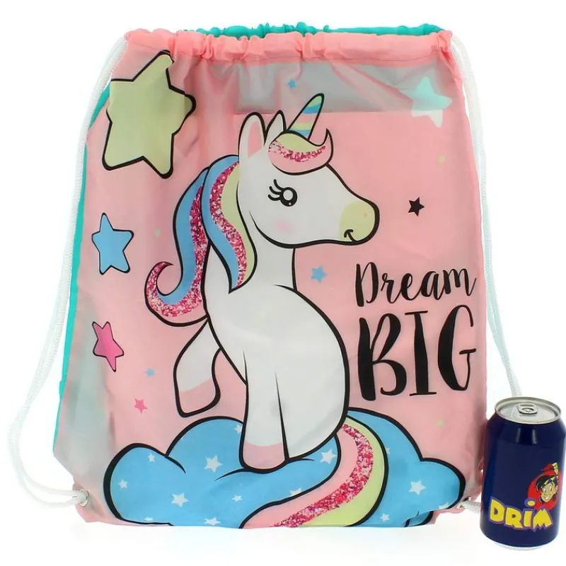 Mochila de tipo saco con un diseño muy especial y original. En la parte frontal, con un fondo en rosa, encontrarás la ilustración de un adorable y risueño unicornio sobre una esponjosa nube. Tiene complementos decorativos brillantes y va acompañado de la frase en inglés ‘Dream Big’/ Sueña en grande. Está fabricada en PVC y tiene unas dimensiones de 44.5 cm x 38 cm aproximadamente.
