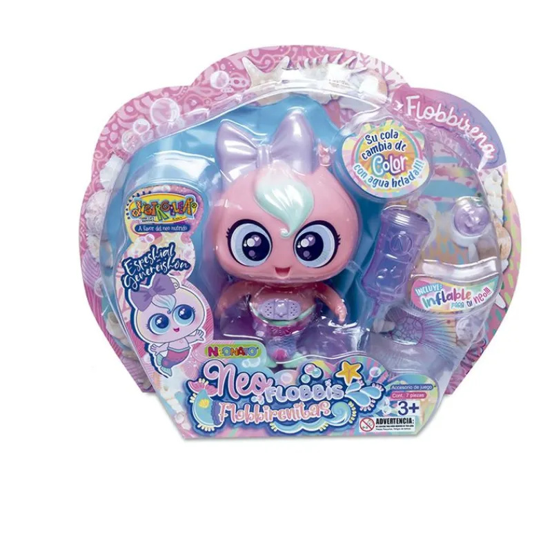 Flobbisirena es una muñeca de la colección Ksimeritos a la cual le gusta tanto nadar y el agua, que se ha transformado en sirena !! su cola cambia de color al contacto con el agua fría y esta deseando se adoptada por ti!! para difrutar del agua contigo, incluye un infable para tu Neo . Recomendado a partir de 3 años