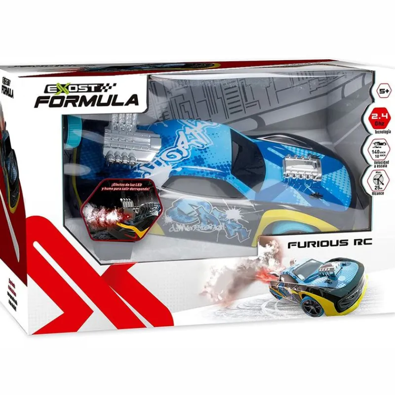 Exost Furious R/C es un alucinante vehículo con diseños aerodinámico y urbano. Su escala es de 1:14 y su mando de 2.4 GHz. Supera cualquier obstáculo, nada se interpondrá en su camino. Utiliza una novedosa tecnología de vapor de agua para generar el efecto humo. Contrólalo mediante el mando profesional. Con impresionantes efectos e humo y luz de su silenciador. Alcanza una velocidad máxima de 12 km/h con un radio de acción de 25 metros. Funciona con 7 pilas LR6 NO incluidas. Recomendado a partir de 5 años.