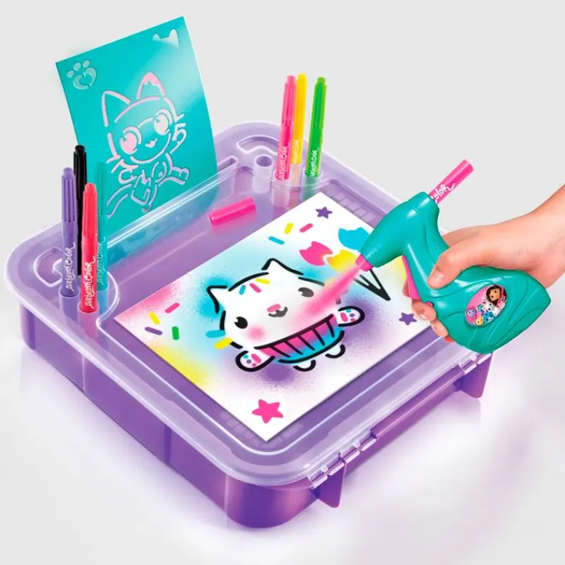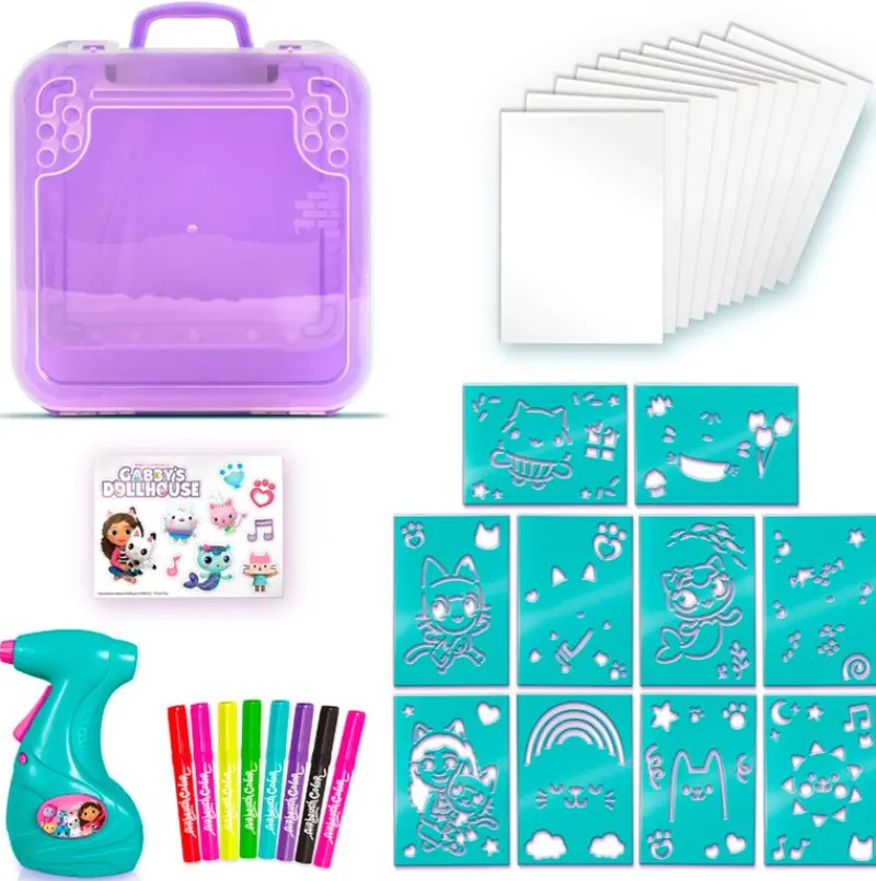 Maletín de actividades inspirado en la serie de animación La Casa de Muñecas de Gabby ¡Crea fantásticos diseños con el maletín! Contiene todo lo que necesitas para crear diseños únicos con aerógrafo: spray electrónico, rotuladores, plantillas, hojas de dibujo… ¡Reutiliza el maletín para guardar y transportar tus proyectos. Recomendado a partir de 6 años.