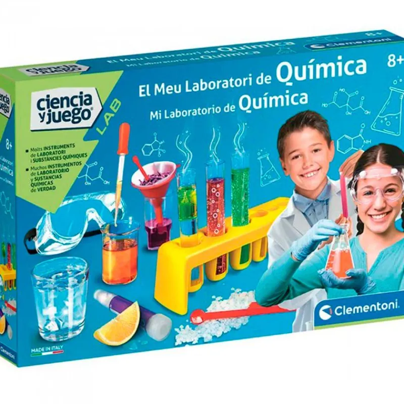 Laboratorio de Química es un pack de la colección Ciencia y Juego con el que los más pequeños de la casa podrán realizar diferentes experimentos químicos de manera segura y sencilla, aprendiendo sobre las reacciones químicas, propiedades de las sustancias y más. En el interior encontrarás gafas de protección, pipetas, portaprobetas, una pinza, una llave de seguridad para probetas, sustancias químicas, vasos con tapones, una escobilla, un cilindro graduado, un embudo, papel de filtro, un agitador, una espátula y un póster de la tabla periódica. Recomendado a partir de 8 años.
