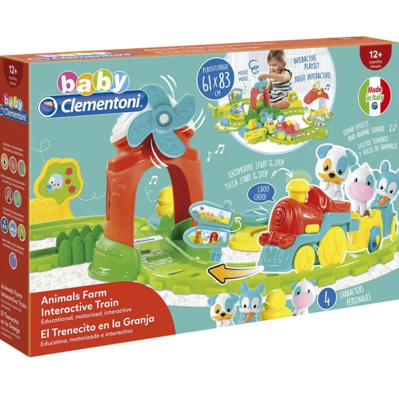 Al tocar la chimenea del tren se mueve y podrá llevar de paseo a los animalitos que incluye en el set: una vaca, un conejo, un perro y un pato.