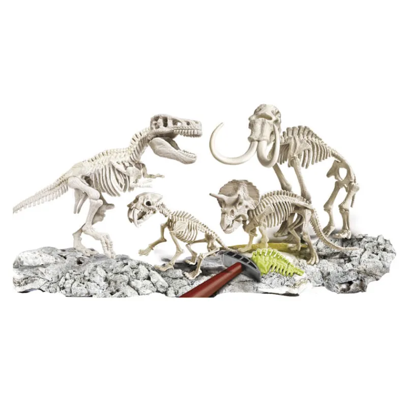 Excava en los bloques de tierra como un palentólogo de verdad y reconstruye los esqueletos de dos dinosaurios ( T-Rex y Triceratops) y de dos animales prehistóricos ( Mamut y Smilodon). Los esqueletos brillan en la oscuridad.